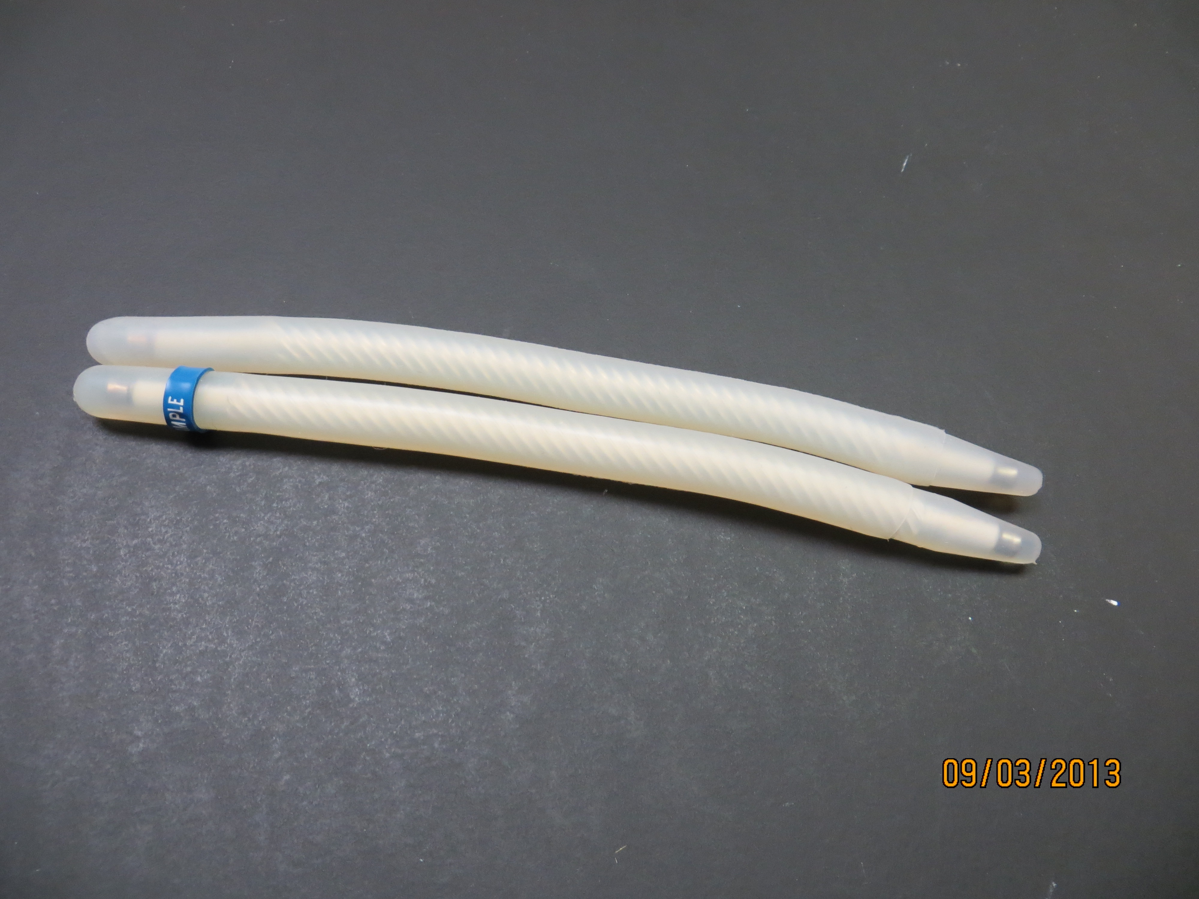 | Another rod-type penile implant. You can see the coiled wire, which provides some malleability to that section of the device. Each penile implant cylinder is cut to length, and a tail cap applied. Two different diameter cylinders are shown. |